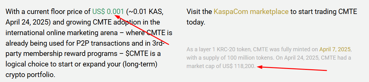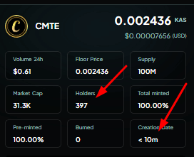 So, Koen, the CMTE owner, apparently has 15 years of experience in the advertising / affiliate business, I suppose 1 minute per year for 15 years is still 15 years, but, well, what knowledge he must have gained to have produced such amazing stats and followers. The above screen shot is take from the Kaspa marketplace where the coin was minted and most trades are performed which can be seen at https://kaspa.com/tokens/marketplace/token/CMTE